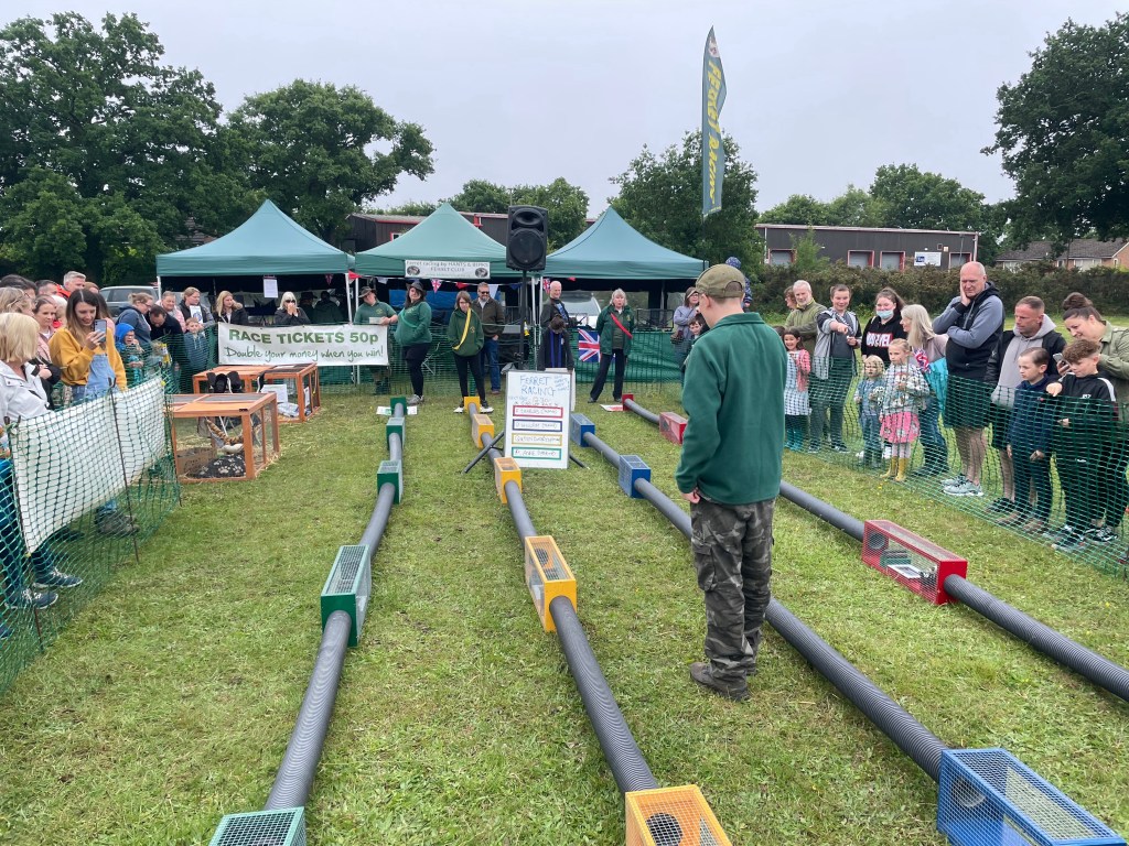 It was a very odd but actually quite rewarding experience. There was a rock choir of about 20 pensioners singing enthusiastically. There was a massive “crew” of about 100 teenage dancers, whose routine seemed to be waving arms and running towards each other. There were beer and tea tents. There were burger vans, a small funfair, charity stalls with raffles. There was a model railway and a hat stall. Even better were the special events in the arena. Dog agility was pretty impressive, birds of prey flying was even more so. Best of all was the ferret racing. Four ferrets put into drain pipes with obstacles, to see which would reach the end first. Don’t worry, there was no cruelty here – these were pet ferrets who were just having fun playing in pipes. Each race could last over 15 minutes, as they wandered up and down the pipes, never quite reaching the end.
