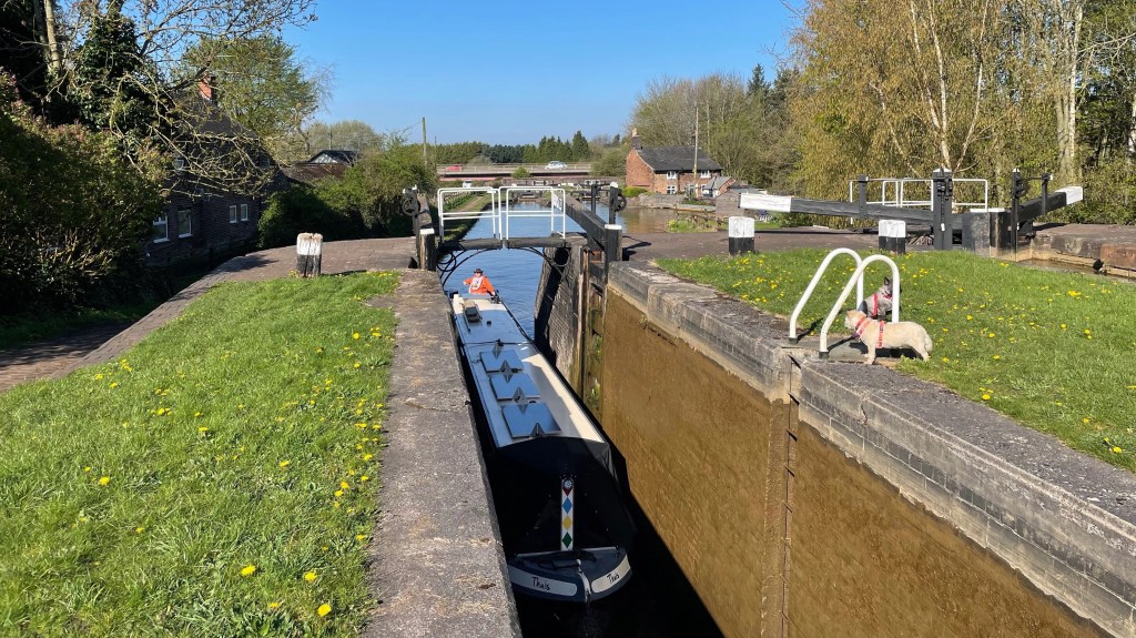 Between Mandy, me and the two dogs we make a great team for things like Heartbreak Hill. She tends to steer the boat, and with the dogs’ help I do the paddles and gates. Doing a stretch like Heartbreak Hill gets us into such a routine that much is done almost unconsciously. For instance these are deep locks, and going uphill we have to make sure not to let too much water into the lock too quickly, or the currents will bang the boat into the lock gates. Instead we have developed a technique of two turns of the windlass, wait two minutes and then the next two turns.