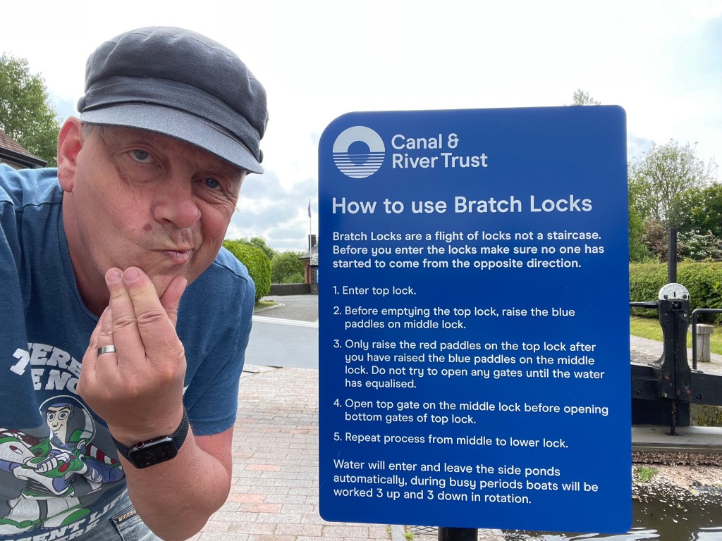 On Sunday, it was back on our journey south. A boat coming the other way warned us that a boat club was ahead of us. Fifteen boats were waiting to go down Bratch Locks. This is a bit of a bottleneck on the canal, because three locks are next to each other, so they allow three boats to go down and then three come up. This means if you are boat four, you will wait around an hour before you can go. If you are boat fifteen, you could be waiting several hours. Fortunately by the time we got there the queue had reduced and we were only held up for around forty minutes. Bratch Locks are fascinating. They were built by Brindley as a staircase, where the top gates of one lock form the bottom gates of the next one. But this used too much water, so around 1820 they were converted to individual locks with about a meter of canal between each lock, and side ponds to hold the water. I have never seen anything like them, and as you can see in the photo, the rules are somewhat complex. Fortunately there were volunteers to help us and all was well.
