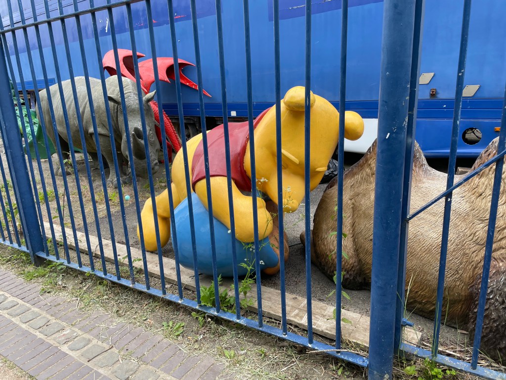 On Wednesday, we continued to the end of the Staffordshire and Worcestershire canal at Stourport. Stourport was once a very small village called Mitton, but after the canal was built became one of the busiest inland ports in Britain, as the canal joins the river Severn and from there large boats sailed down to the sea at Bristol. Nowadays it is a sleepy pretty town, with much history to see. It also has a permanent funfair, where we found this rather sad Winnie the Pooh.