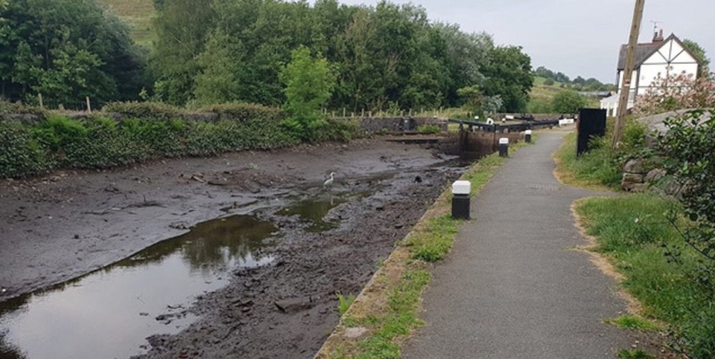 Once or twice a year we find a pound is empty. Last year there was a mile long empty pound near Gloucester after a hire boater went through the bottom lock one evening and left all the paddles up. The year before we grounded in a pound overnight on the Aylesbury canal because of leaky lock gates. This week we have faced three separate empty pounds. The first was about a mile long in Wigan, caused by vandals. The second was about half a mile on the Rufford arm, caused by a lazy boater leaving paddles up. The third was a short planned “dewatering” by the Canal & River Trust (CRT) in order to inspect blocked culverts.