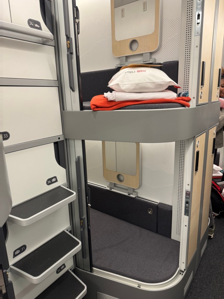 This is one of the newest night trains – having been put into service a month ago. As well as sleeping compartments for 4 or 6 people, it has the innovation of sleeping pods, known as mini cabins. These are the price of a bed in a couchette but for individual travellers like me, offer privacy and all the mod cons, such as being able to choose whether I want the lighting red, blue, yellow or white.