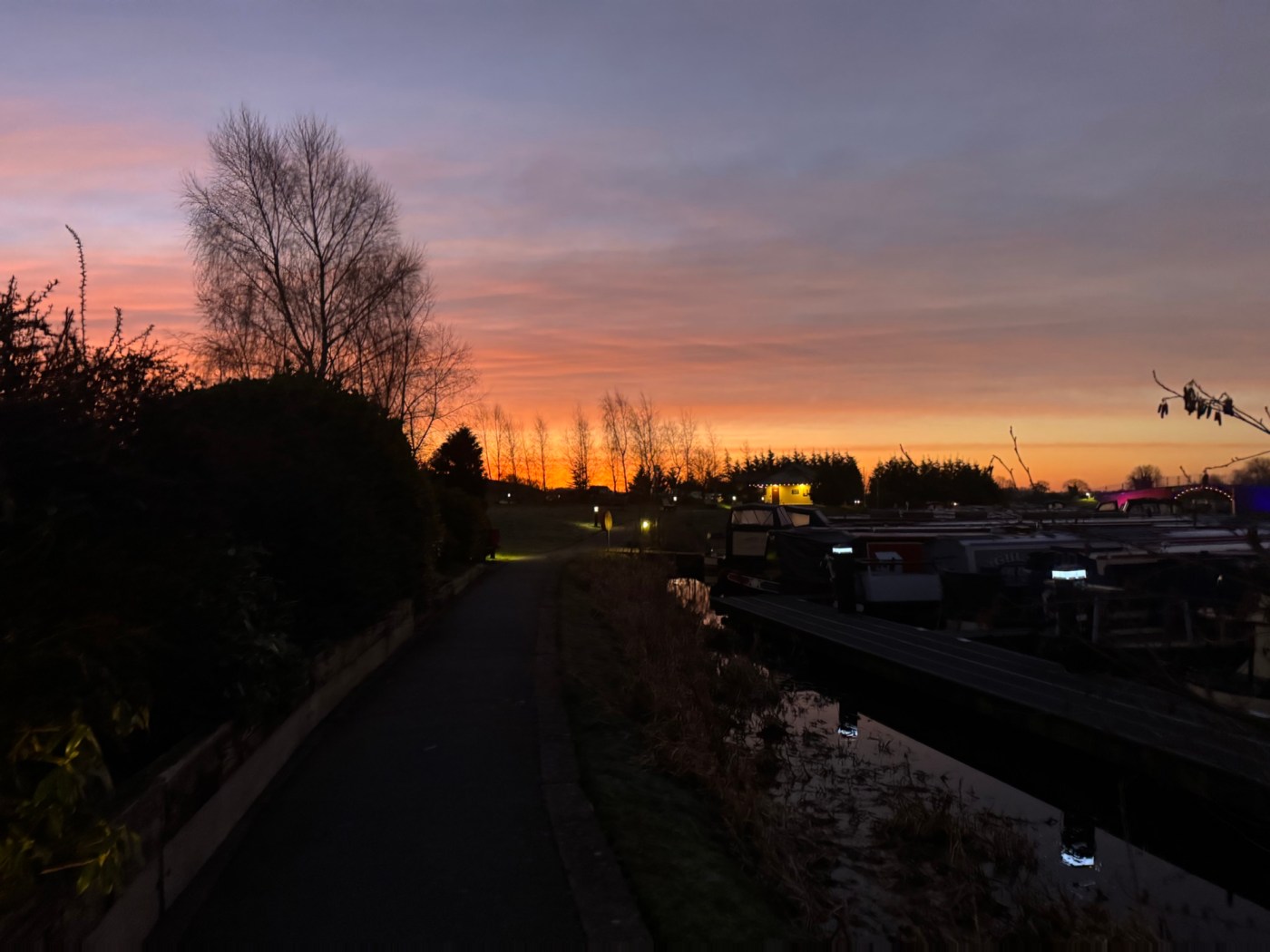 I think this week’s weather has been about as perfect as it can get. Each morning I have woken up to a hard frost, with ice coating the roof of the boat. The sunrises have been stunning, with the light glittering across the fields and the water. During the day the sun has warmed us to T Shirt temperatures, and then in the evening as the light fades, it has got cold again, very quickly, with amazing skies full of stars and planets.