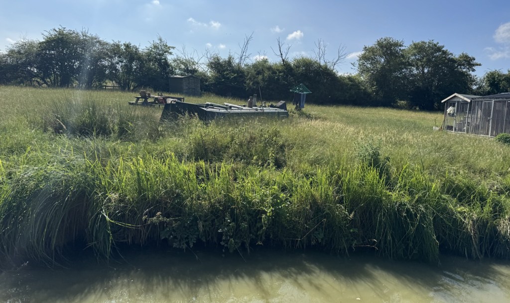 We saw this narrowboat landlocked in a field. The owner has cut a small canal into his land, moved his boat into it and then filled the canal in behind him. This means he can live on the boat near the canal without paying a licence to CRT. He even has his own greenhouse to grow food. It is not what I boat for. I love the travelling. But it is one way to deal with droughts!